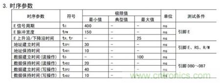 也許你還注意到了上面有許多關于時間的標注,這也是個十分重要的信息,這些時間的標注表明了某些狀態(tài)所要維持的最短或最長時間。因為器件的工作速度也是有限的,一般都跟不上主控芯片的速度,所以它們直接之間要有時序配合。話說現(xiàn)在各種處理器的主頻也是瘋狂增長,日后搞不好出現(xiàn)個雙核單片機也不一定就是夢話。下面是時序參數(shù)表: