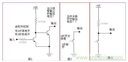 我們將圖1簡(jiǎn)化成圖2的樣子。圖2中的開關(guān)受軟件控制,“1”時(shí)斷開,“0”時(shí)閉合。很明顯可以看出,當(dāng)開關(guān)閉合時(shí),輸出直接接地,所以輸出電平為0。而當(dāng)開關(guān)斷開時(shí),則輸出端懸空了,即高阻態(tài)。這時(shí)電平狀態(tài)未知,如果后面一個(gè)電阻負(fù)載(即使很輕的負(fù)載)到地,那么輸出端的電平就被這個(gè)負(fù)載拉到低電平了,所以這個(gè)電路是不能輸出高電平的。