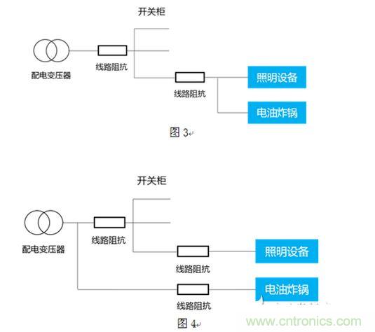分析:該咖啡廳于當年夏天新安裝了一臺電油炸鍋,當時日光強烈,無人注意照明燈光問題,咖啡廳至配電柜饋線距離比較長,電纜不夠粗,線路阻抗較大。