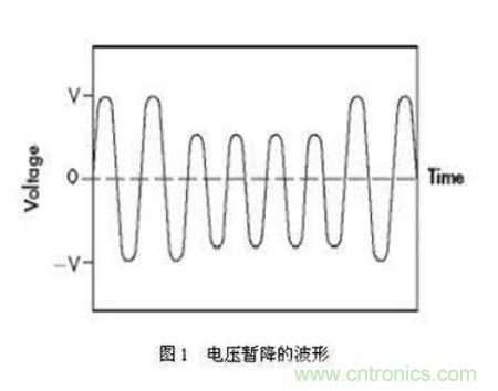 電壓暫降就是電壓突然降低,但是在很短時(shí)間內(nèi)又恢復(fù)正常,如圖1 所示,電壓暫降與電壓過低的區(qū)別是電壓暫降的時(shí)間很短,但是降低的幅度很大,有時(shí)暫降后的電壓僅為正常電壓的10%。