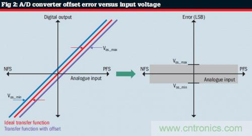 偏移誤差(VOS)。該誤差是A/D轉換器實際傳遞曲線和理想傳遞曲線之間的恒定差異(見圖2)。它是測定的數字輸出,通過把A/D轉換器輸入端短接到接地(GND)獲得。