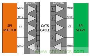 SN65LVDT41和SN65LVDT14的架構(gòu)可以使整條SPI總線轉(zhuǎn)化為支持LVDS:同一方向上用于MOSI,SCLK和CS信號的4個收發(fā)器,相反方向上用于MISO信號的1個收發(fā)器。LVDS芯片組也具有內(nèi)置端接帶來的額外優(yōu)勢,應(yīng)用簡單,還可以減少電路板空間本就非常寶貴的應(yīng)用中的組件數(shù)量。圖2顯示的是使用上述芯片組的一個已擴(kuò)展SPI總線架構(gòu)的組成結(jié)構(gòu)。這個實(shí)現(xiàn)方式并不要求必須使用5類屏蔽雙絞線(STP),但是如果使用此類線纜的話,會使這種架構(gòu)的實(shí)現(xiàn)方式更加簡單。