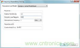 模型生成好后,電容出線的兩端會自動生成Wave Port,所以不需要你手動去設(shè)置Port,這里還有一點就是材料的參數(shù)以及孔徑需要你去設(shè)置,材料參數(shù)設(shè)置因為是前仿真,所以用Djordjevic-Sarkar Model Input簡單的頻變模型(圖7),只需要設(shè)置一個頻點的Dk和Df值就可以求解寬帶的頻變曲線。具體設(shè)置界面如下所示,這里我們板材選用FR-4,Dk和Df的值選擇1GHz頻點。