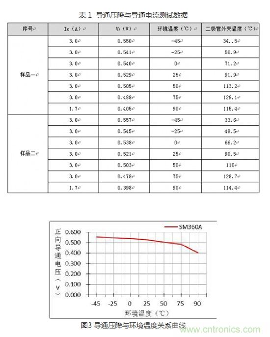 在我們開發(fā)產品的過程中,高低溫環(huán)境對電子元器件的影響才是產品穩(wěn)定工作的最大障礙。環(huán)境溫度對絕大部分電子元器件的影響無疑是巨大的,二極管當然也不例外,在高低溫環(huán)境下通過對SM360A的實測數(shù)據(jù)表1與圖3的關系曲線可知道:二極管的導通壓降與環(huán)境溫度成反比。在環(huán)境溫度為-45℃時雖導通壓降最大,卻不影響二極管的穩(wěn)定性,但在環(huán)境溫度為75℃時,外殼溫度卻已超過了數(shù)據(jù)手冊給出的125℃,則該二極管在75℃時就必須降額使用。這也是為什么開關電源在某一個高溫點需要降額使用的因素之一。