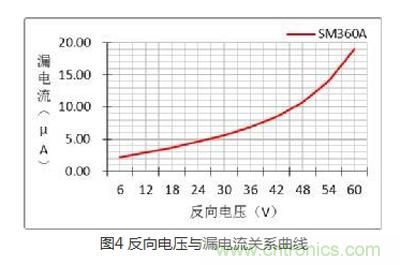 在二極管兩端加反向電壓時,其內部電場區(qū)域變寬,有較少的漂移電流通過PN結,形成我們所說的漏電流。漏電流也是評估二極管性能的重要參數(shù),二極管漏電流過大不僅使其自身溫升高,對于功率電路來說也會影響其效率,不同反向電壓下的漏電流是不同的,關系如圖4所示:反向電壓愈大,漏電流越大,在常溫下肖特基管的漏電流可忽略。