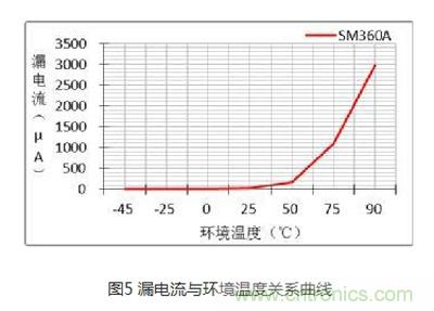 其實對二極管漏電流影響最大的還是環(huán)境溫度,下圖5是在額定反壓下測試的關系曲線,從中可以看出:溫度越高,漏電流越大。在75℃后成直線上升,該點的漏電流是導致二極管外殼在額定電流下達到125℃的兩大因素之一,只有通過降額反向電壓和正向導通電流才能降低二極管的工作溫度。