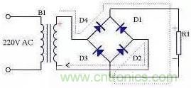 由于全波整流電路需要特制的變壓器,制作起來比較麻煩,于是出現了一種橋式整流電路。這種整流電路使用普通的變壓器,但是比全波整流多用了兩個整流二極管。由于四個整流二極管連接成電橋形式,所以稱這種整流電路為橋式整流電路。