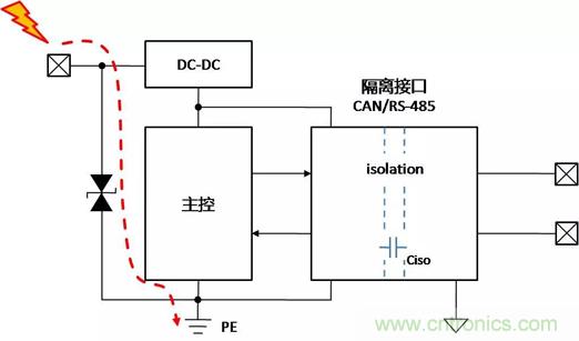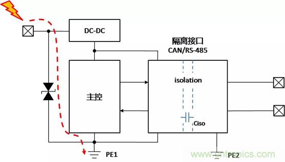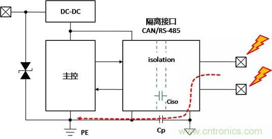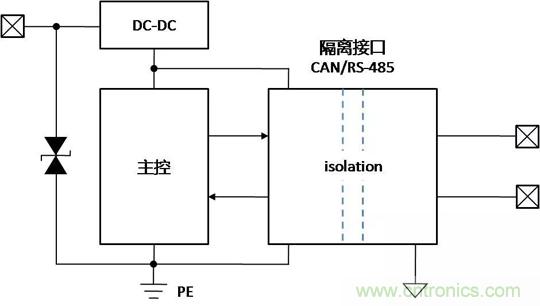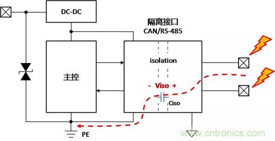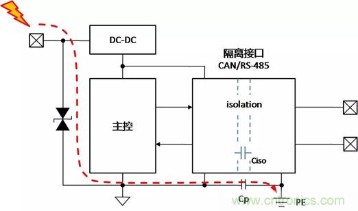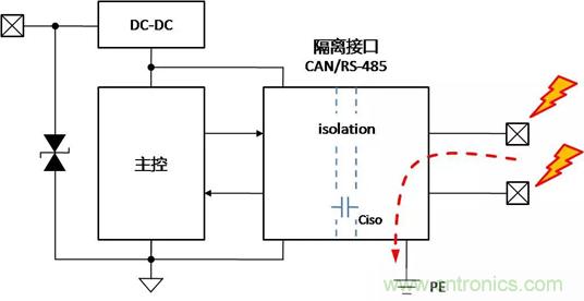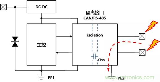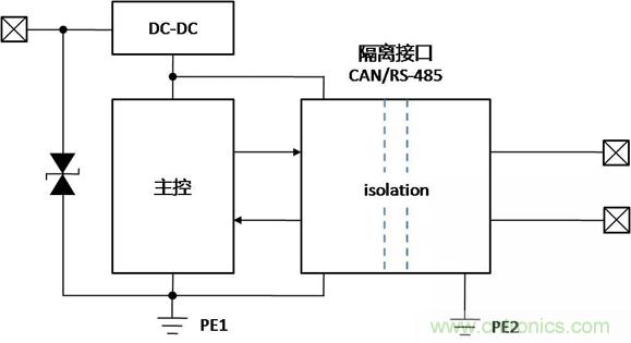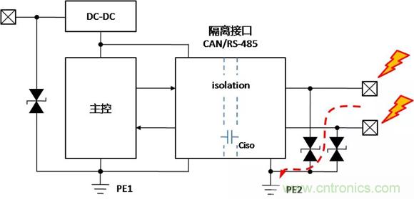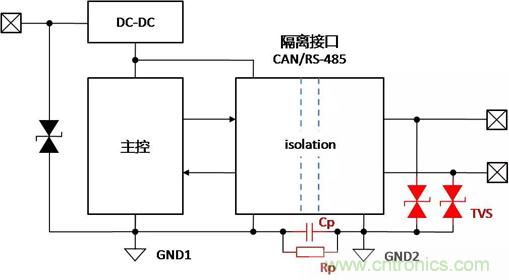 帶隔離通信接口的設(shè)備,在不同的使用、安裝狀態(tài)下,接口會(huì)表現(xiàn)出完全不同的ESD特性,了解設(shè)備在不同的使用狀態(tài)下,ESD對(duì)接口的影響的機(jī)理,才能有針對(duì)性地增加保護(hù)器件,提升隔離接口的ESD能力。下面以帶有隔離CAN或RS-485通信接口為例,對(duì)常見的設(shè)備狀態(tài)下,ESD的作用機(jī)理進(jìn)行分析,并提出相應(yīng)的改善措施。