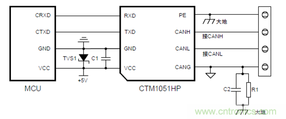 由于設(shè)備實(shí)際應(yīng)用中會(huì)存在各種不同的狀態(tài),對(duì)于與上述描述不同的情況,也可按以上的方法進(jìn)行分析,并有針對(duì)性的增加保護(hù)器件,從而達(dá)到提升ESD抗擾能力的作用。廣州致遠(yuǎn)電子有限公司基于多年的總線防護(hù)設(shè)計(jì)積累推出了高防護(hù)等級(jí)隔離模塊——CTM1051(A)HP系列。該系列符合國(guó)際ISO11898-2標(biāo)準(zhǔn),靜電防護(hù)等級(jí)可達(dá)接觸±8kV,空氣放電±15kV,浪涌防護(hù)可達(dá)±4kV隔離CAN解決方案,具體如下圖15所示,能夠適用于各種惡劣的工業(yè)現(xiàn)場(chǎng)環(huán)境。應(yīng)用簡(jiǎn)便,即插即用,應(yīng)用原理圖如下圖16所示。