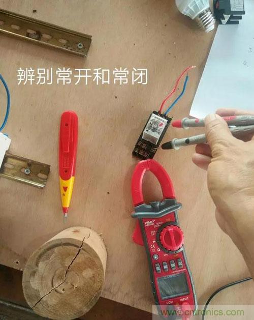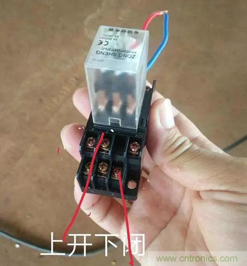 中間繼電器的每一組控制觸點分為公共端,常閉點和常開點。和線圈進線端一個方向的是觸點公共端,出線端分常開和常閉。判斷常開和常閉的方法是把繼電器插上繼電器座,用萬用表的通斷檔分別測量公共端到兩個出線端的通斷,通的是常閉,不通的是常開。如果沒有萬用表,我這里有一個小經驗告訴大家,一般中間繼電器的觸點都是上開下閉,就是上面一排是常開點,下面一排是常閉點。大家可以參考一下。后面有圖。