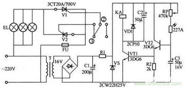 白天在較強光照下,光導管227A(一種光敏電阻)兩端阻值很小,約20~50kΩ,晶體管VT2獲得基極電流而導通,VT1從R2上得到正偏電壓也導通,繼電器線圈KA得電,繼電器的常閉觸電②、③斷開,兩只晶閘管V1和V2沒有觸發信號而不導通,因而燈泡EL不亮。