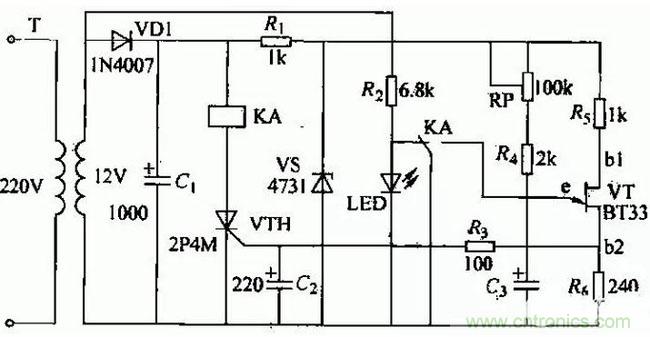 電容G上電壓按指數規律逐漸升高,當此電壓大于單結晶體管VT的峰點電壓時,單結晶體管導通,G經VT的eb1極和風放電,在風上輸出脈沖電壓,觸發藩閘管VTH導通使繼電器KA吸合,KA的觸頭同時將C3短路,使之迅速放電,單結晶體管的ebl之間電壓迅速下降,當降到Vr.的谷點電壓時,Vr關閉。同時LED指示燈點亮。當切斷電源時,繼電器KA釋放,電路恢復原始狀態,等待下次動作。通過調節RP.可以調整延時時間。