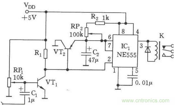 如下圖所示,該電路由聲音檢測電路和單穩觸發電路組成,執行元件為繼電器.VT1完成輸入音頻信號的放大,當有信號來時,使555置位,K吸合。同時,VT2導通,C2上的電荷通過555內部的放電管和VT2迅即放完。聲音過后,VT1、VT2截止,C2通過R2、RP2對其充電,單穩態電路的暫穩時間td=l.1(R2 RP2)C2,延時范圍在0.05~0.5秒,可通過RP2來調節。