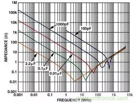 圖1:電容器的阻抗與頻率的關系。