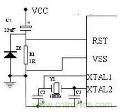 MCS-51片內(nèi)有一個高增益反相放大器,其輸入端(XTAL1)和輸出端(XTAL2)用于外接石英晶體和微調(diào)電容,構(gòu)成振蕩器,如圖所示。電容C2和C3對頻率有微調(diào)作用,電容容量的選擇范圍一般為30pF士10pF。振蕩頻率的選擇范圍為1.2~12MHz。