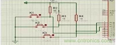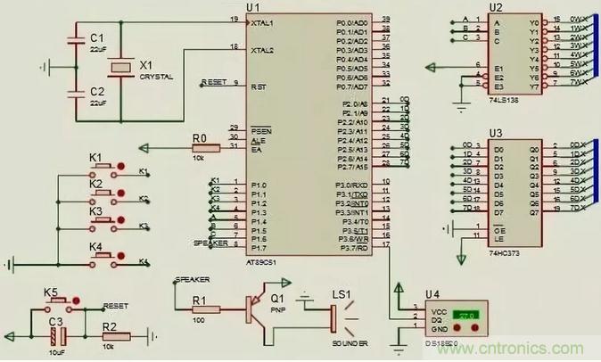 當(dāng)按1次K3進入鬧鐘設(shè)置界面,時鐘繼續(xù)進行走時,按K2對秒進行設(shè)置;當(dāng)按2次K3,按K2對分進行設(shè)置;當(dāng)按3次K3,按K2對秒進行設(shè)置;當(dāng)按下4次K3時,鬧鐘設(shè)置完畢進入時鐘顯示界面。電路圖如下: