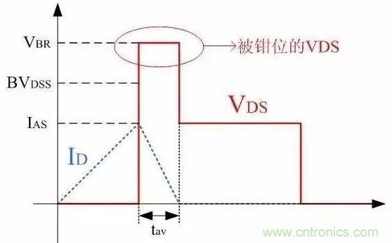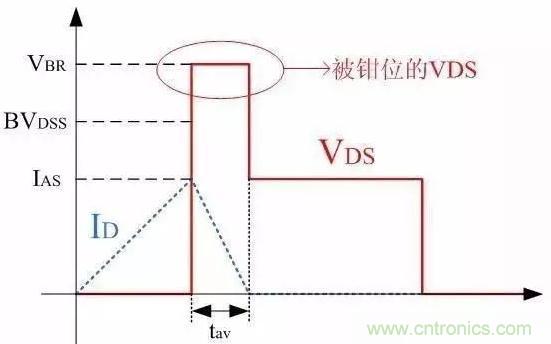 MOSFET雪崩時,波形上一個顯著的特點是VDS電壓被鉗位,即上圖中VDS有一個明顯的平臺