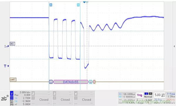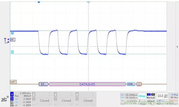增加終端電阻使通信線纜上的電流增大,產(chǎn)生了較大的壓差,降低了接收端的信號幅值。RSM485ECHT在1200m,115.2kbps首端和末端的信號波形如下圖所示(0.75mm2通信線),末端信號與首端信號相比下降了0.7V左右。