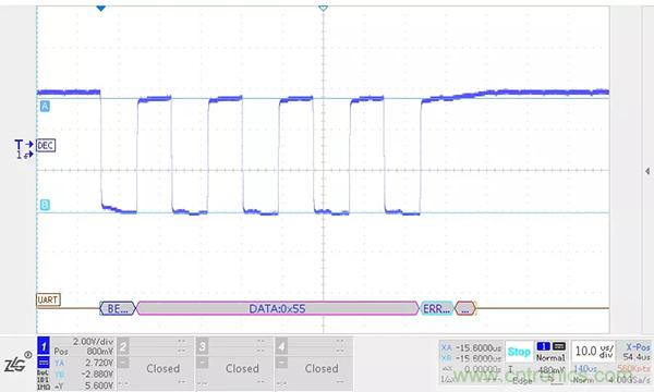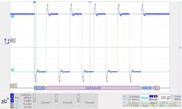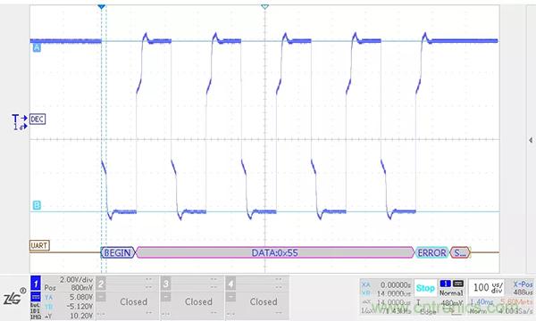 RS-485總線上的負(fù)載越大,RS-485收發(fā)器輸出差分電壓幅值越低,RSM485ECHT在5m,500kbps的情況下不加終端電阻和加終端電阻的波形如下圖所示。