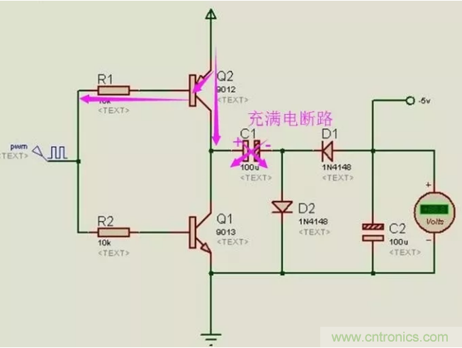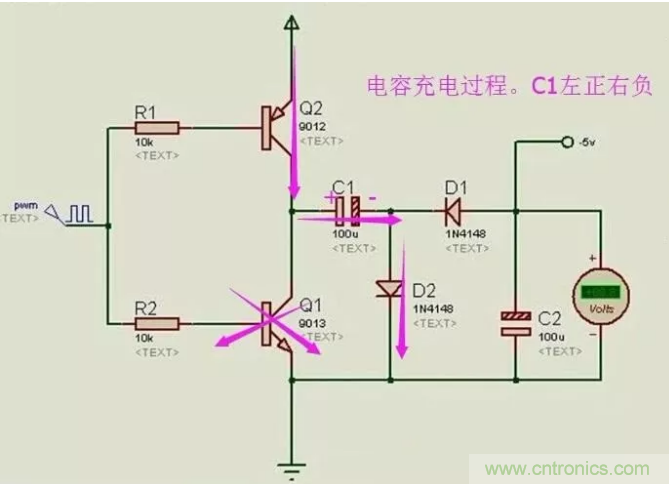 1、電容充電:當PWM為低電平時,Q2打開,Q1關閉,VCC通過Q2給C1充電,充電回路是VCC-Q2-C1-D2-GND。C1上左正右負。