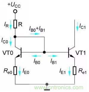 與典型的靜態工作點穩定電路一樣,Re0和Re1是電流負反饋電阻,因此與鏡像恒流源電路相比,比例恒流源的輸出電流IC1具有更高的穩定性。