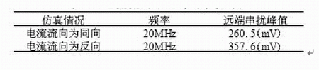 由仿真結果可知,電流流向為反向時的遠端串擾峰值(357.6mm)要大于電流流向為同向時的遠端口串擾峰值(260.5)。同時由圖4可以看到,當干擾源的電流流向改變后,被干擾源的串擾極性也改變了。這說明串擾的大小和極性與相應干擾源上信號的電流流向有關的。