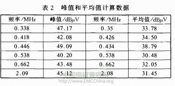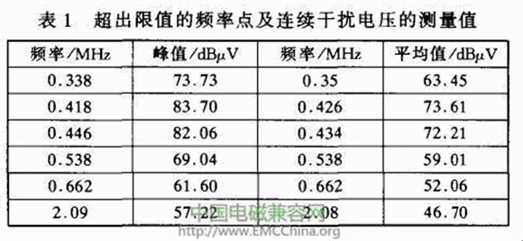 圖1是某一臺空調產品連續干擾電壓的測試曲線(執行GtM343.1—2003《家用和類似用途電動、電熱器具,電動工具以及類似電器無線電干擾特性測量方法和允許值》l11)。表1是超出限值的一些頻率點及連續干擾電壓的峰值和平均值的測量值。