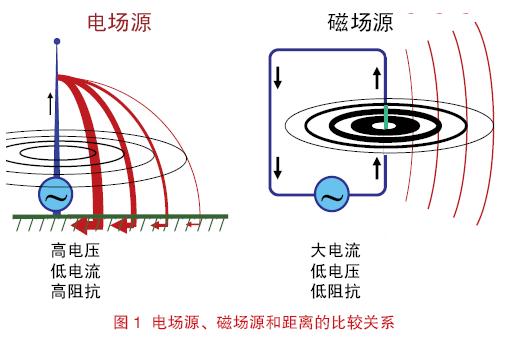 如果電荷作加速或減速運動或者電流增大或減小,就會產生變化的磁場。如此一來就會產生變化的電場,源就會輻射出電磁能量了。電磁能量既可以產生于高阻抗的電場源(高電壓-小電流)也可以產生于低阻抗的磁場源(大電流-低電壓)。如圖1 所示的單極天線和環天線就是這兩種源的典型代表。