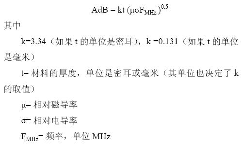 在更高的頻率上,殼體的屏蔽效能取決于吸收。吸收和入射到殼體上的波的種類無關,它由如下所示的表達式給出: