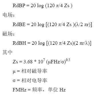 高阻抗源(電場)的波阻抗會大于120π 歐姆,而且它會隨著間隔距離的增大而逐漸減小,直到極限值。由此,有三個等式被用于計算屏蔽體表面的反射。這些等式假設Zw/Zs 或Zs/Zw >10。當λ/2πr或2πr/λ=1 時,電場和磁場等式就變得和平面波的等式一致了。