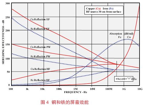 需要注意的是Zs 會隨頻率的上升而增大,這會導致反射系數數值的減小。圖4 給出并對比了銅和鐵的屏蔽效能。