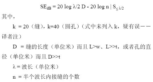 雖然縫隙的形狀各異,但如果能夠將屏蔽效能視為和等效形狀縫隙天線的輻射效率相反的問題,就可以得到一個簡單的模型來計算最壞情況下縫隙的屏蔽效能。雖然這種假設也會導致一些錯誤,但對設計而言就足夠了,因為實際的屏蔽效能會高于計算給出的結果。最大開口尺寸為D 的單縫隙的屏蔽效能由下面等式的第一部分給出。等式的第二部分是對多個同樣尺寸縫隙情況的修正。