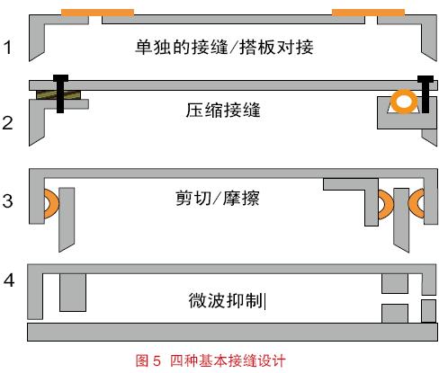 有四種不同構造的接縫形式可供選擇,即(1) 單獨接縫,(2) 壓縮接縫,(3) 剪切或摩擦接縫,(4) 絕緣或阻塞抑制接縫。這些接縫的結構如圖5 所示。最能夠代表單獨接縫的是搭板對接。示例中的頂部和底部接縫處于安裝在機架上的空白面板或活頁抽屜之間。因為沒有交疊,所以很難應用傳統的襯墊材料。此時傾向使用的密封方法是在接縫處使用帶背襯粘合的導電薄片或織物帶。