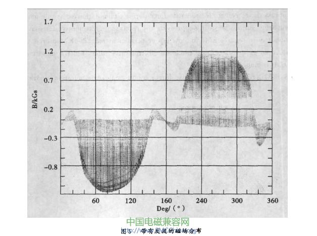 則會(huì)嚴(yán)重影響EMi,且不易被發(fā)現(xiàn)。以圖5為例.兩磁極在靠近中性線的位置處均有與該磁極極性相反的一段反波.仔細(xì)分析借偏的原理可知,該反波事實(shí)上相當(dāng)于一個(gè)與正常換向極作用相反的附加磁極,當(dāng)其被轉(zhuǎn)子換向線圈切割時(shí),產(chǎn)生的電動(dòng)勢(shì)與電抗電動(dòng)勢(shì)同向,也就是會(huì)惡化換向;當(dāng)其分布角度超過借偏角度時(shí),會(huì)完全抹殺借偏的作用。