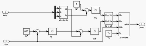 控制電路仿真模型如圖3所示。它主要由PI控制器模型、坐標變換模型以及矢量控制器模型等部分組成。其中,坐標變換和矢量控制器仿真模型的建立主要根據矢量控制原理搭建而成[2],其仿真模型如圖4所示。