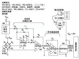 這是圖1所示的方框圖中模擬部分。放大器和參考電壓連接到ADC,ADC再連接到微控制器。為了建立一個(gè)二階低通濾波器(A3)需要兩個(gè)電阻器、兩個(gè)電容器和MCP6022運(yùn)算放大器。另一個(gè)放大器組成了一個(gè)儀器放大器,其中使用了旁路電容器。
