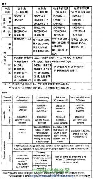表1不包括以無線電發(fā)射接收為主要功能的玩具(如遙控車、對講機(jī)等).歐洲對該類產(chǎn)品有專用標(biāo)準(zhǔn)要求,在此就不另行介紹。
