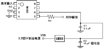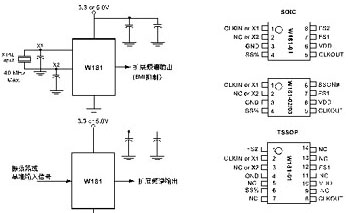 W181-01/02/03有8引腳SOIC封裝及14引腳TSSOP封裝,及其典型應用電路框圖和三種封裝管腳排列如圖1所示。