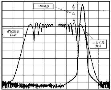 使用擴展頻譜定時信號發生的好處如圖3所示。它表示出了一個時鐘諧波EMI的分布。將典型時鐘的EMI與Cypress擴展頻譜頻率定時信號發生的EMI進行比較。請注意典型時鐘中的尖峰信號,該尖峰信號使系統的準峰值EMI測試衰退。經過頻譜擴展后,峰值能量將極大減少(至少8dB),因為能量通過一個更寬的帶寬散發了。