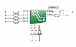 顯然圖10顯示的裸板情況下的輸入阻抗的特性曲線在低頻時不滿足輸入阻抗的特性要求,在高頻時也有部分頻段超標。要改善輸入阻抗的話可以考慮添加旁路電容,在仿真電路的電容位置加上容值為10nF的電容,同時為了更加準確地模型實際的電容的特性,需要考慮電容自身的寄生電感和電阻。這里,將電容的寄生電感值設為1nH,電阻值設為0.01Ω。其仿真電路如圖11所示。