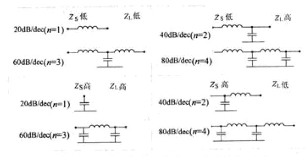 EMC設(shè)計(jì)中的濾波器通常指由L,C構(gòu)成的低通濾波器。濾波器結(jié)構(gòu)的選擇是由"最大不匹配原則"決定的。即在任何濾波器中,電容兩端存在高阻抗,電感兩端存在低阻抗。圖1是利用最大不匹配原則得到的濾波器的結(jié)構(gòu)與ZS和ZL的配合關(guān)系,每種情形給出了2種結(jié)構(gòu)及相應(yīng)的衰減斜率(n表示濾波器中電容元件和電感元件的總數(shù))。