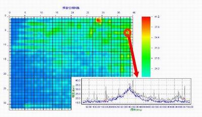 在執行頻譜/空間掃描功能時,把工作著的PCB放置到掃描器上,PCB被掃描器的柵格劃分為7.6mm×7.6mm的小格(每個小格含有一個H場探頭),執行對每個探頭的全頻段掃描(頻率范圍可以從10kHz-3GHz)后,Emscan最終給出兩張圖,分別為合成頻譜圖(圖1)和合成空間圖(圖2)。