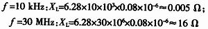 當(dāng)一段導(dǎo)線與其他導(dǎo)線遠(yuǎn)離并且其長度遠(yuǎn)大于寬度時(shí),導(dǎo)線的自感量為0.8 μH/m,那么10 cm長的導(dǎo)線的電感量是0.08μH。再由下面的公式求出導(dǎo)線感抗:XL=2πfL,下式中,f為導(dǎo)線通過信號(hào)的頻率(Hz),L為單位長度導(dǎo)線的自感量(H)。所以分別計(jì)算出該導(dǎo)線在低頻和高頻下的感抗值: