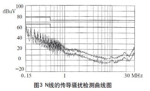 在3m法電波暗室對試驗樣機(jī)進(jìn)行測試,其L、N線的傳導(dǎo)騷擾檢測曲線如圖2、3所示,輻射騷擾的垂直極化掃描曲線如圖4、5所示。