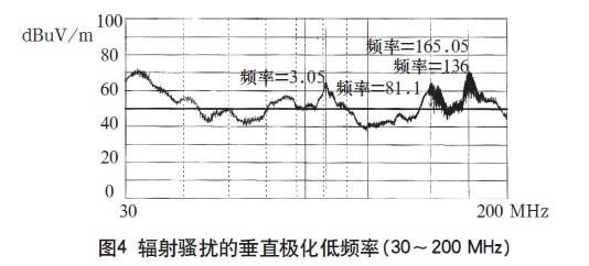 本開關(guān)電源一次通過了傳導(dǎo)騷擾的測試,測試波形如圖2、3所示。輻射騷擾高頻段230~1000MHz也測試合格,如圖5所示。只是在30~200MHz頻段范圍內(nèi)的垂直極化指標(biāo)超標(biāo),最大超標(biāo)20dB,如圖4所示。
