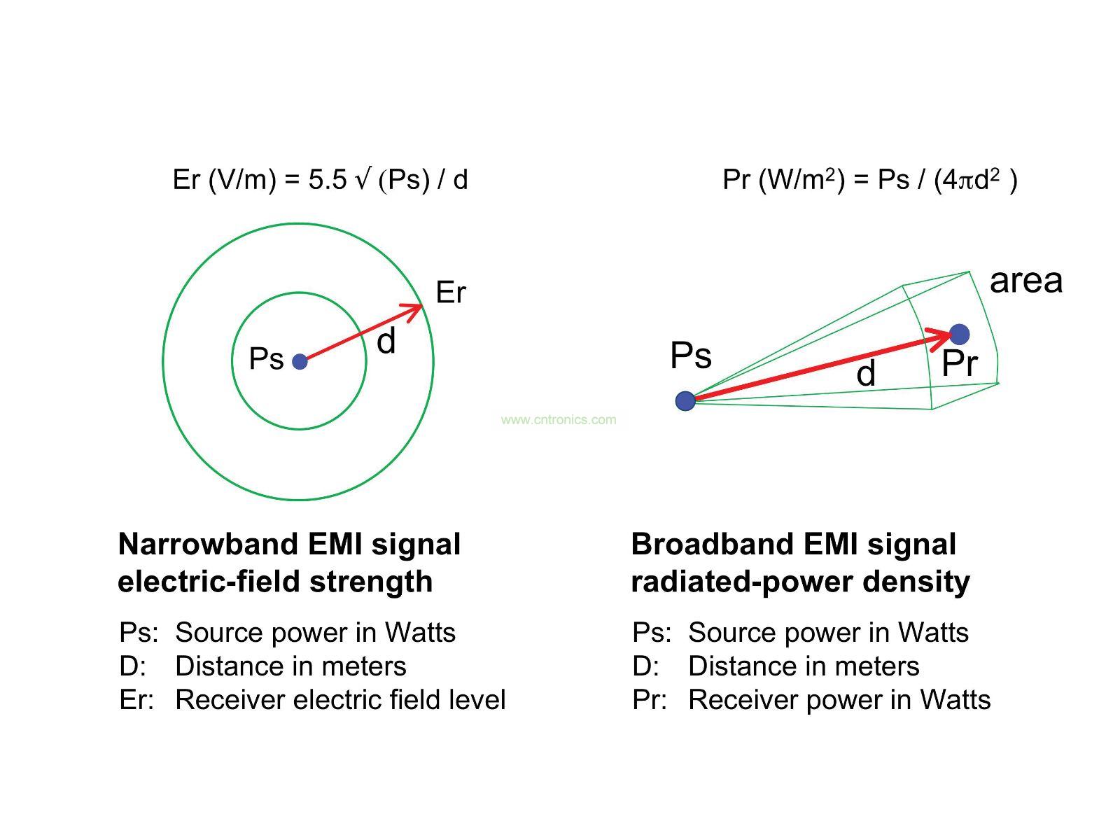 呈輻射狀的電磁干擾(EMI) 信號會從輻射源傳播至某個接收單元。根本而言,這些信號的功率或者電壓強度在“觸及”敏感的電路時,取決于發送器的功率/天線增益以及輻射源和接收器之間的距離(請參見圖1)。