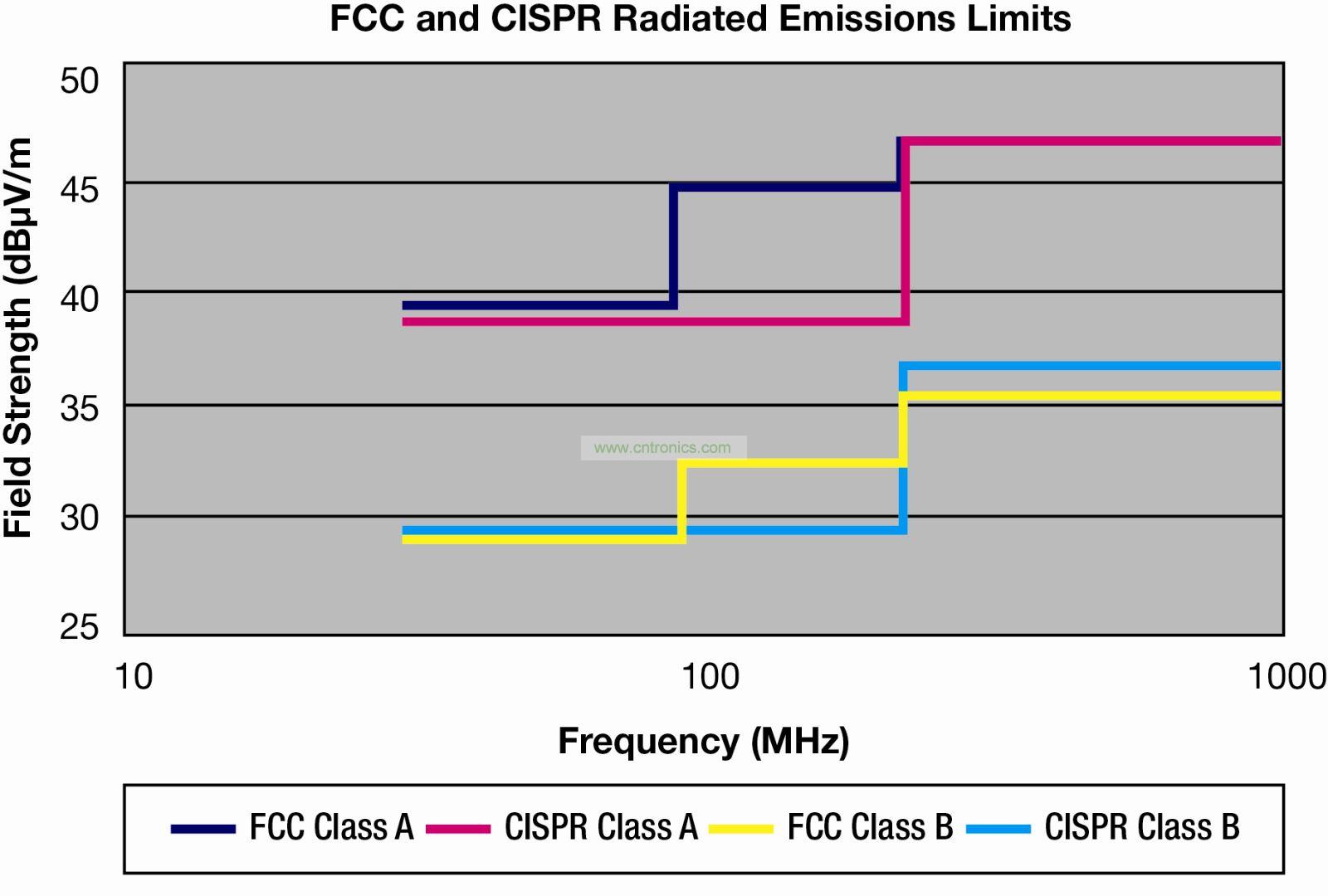 圖2 FCC 和CISPR 輻射限制—30MHz到1GHz,測量距離10m