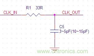 2、在時鐘信號線上,通常需進行源端阻抗匹配,如33R的匹配電阻;同時,在匹配電阻之后,對于頻率高于66MHz的時鐘,加一個3~5pF的電容,對于頻率低于66MHz的時鐘,可加一個10~15pF的電容,形成RC濾波器,抑制500M以上的高頻輻射。其中,加大R和C可減小EMI輻射,但時鐘波形也會變差。