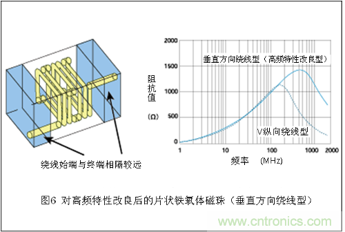通過前記圖3中介紹的片狀鐵氧體磁珠阻抗頻率特性可以看出,阻抗值以 400-500MHz范圍為界開始減少。這是由于片狀磁珠的結構所帶來的影響。一般來說,電感器的阻抗會隨著頻率的上升而逐步增大。然而,如圖5所示,普 通的片狀鐵氧體磁珠內部在繞線始端(入口)和終端(出口)附近會存在相互較為接近的部位。由于這個部分會發生靜電耦合(存在一個微型電容的狀態),高頻電 流通過這里時會出現不容易受電感器阻抗影響的情況。由于頻率越高,靜電耦合部分越容易通過,因此頻率越高所顯示的阻抗也就越低。