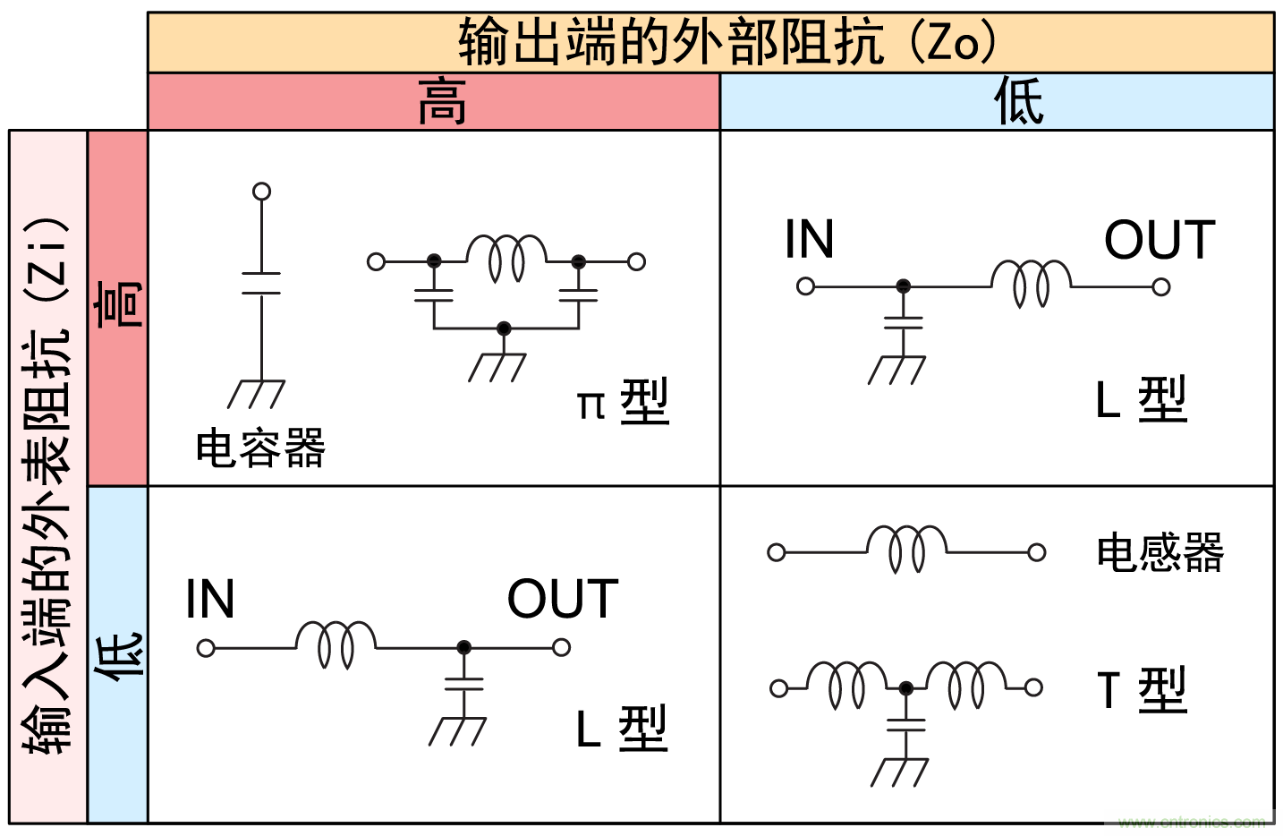 另 一方面,電感器具有所謂的用高阻抗使高頻噪聲反彈的作用,因此電感器與高阻抗部分相接則效果差,反之與低阻抗的電路相接則效果好?此原理歸納于圖2中?圖 中顯示了輸入端阻抗和輸出端阻抗的高低和該條件下噪聲除去效果好的濾波器結(jié)構(gòu)?從圖中可以看出,對于L型濾波器這類不具有對稱結(jié)構(gòu)的濾波器,若輸入輸出端 接反,則效果發(fā)生變化?使用時應加以注意?